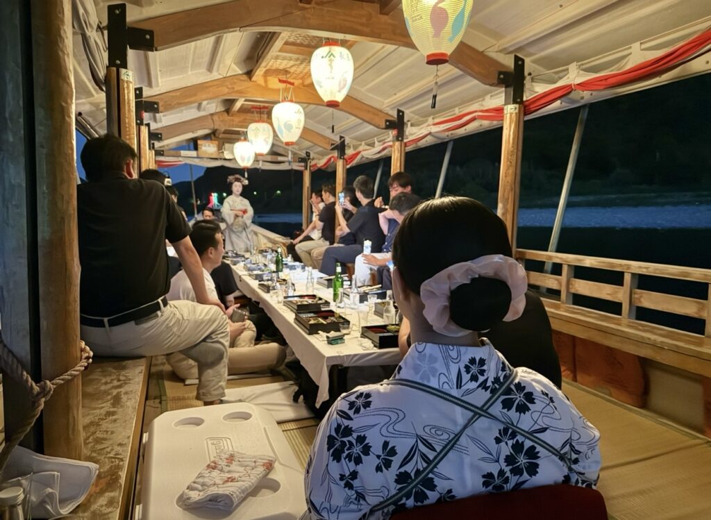 岐阜長良川では鵜飼観覧船でのご宴席を「船遊び」と申します。お客様とご一緒にお船に乗船し芸舞妓がおもてなしをいたします。裏方として学院生も乗船し現場実習をいたしております。