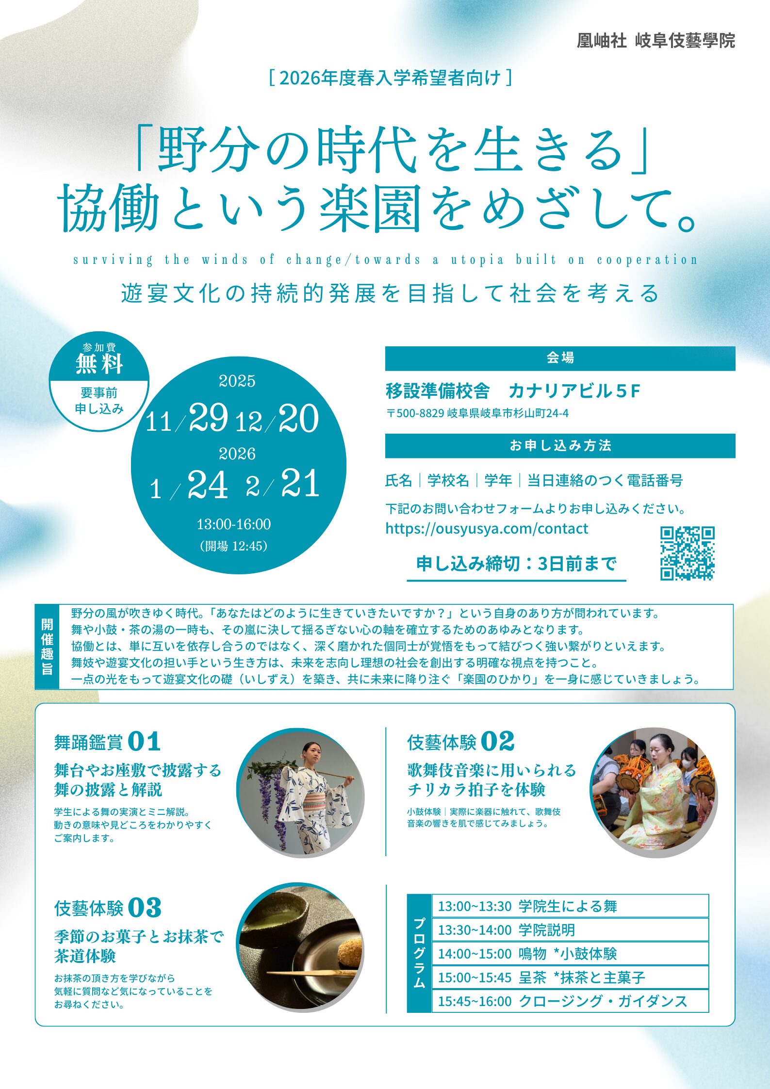 岐阜伎藝學院では、2026年度春入学希望者向けの学院見学会を開催します!日本の伝統文化である「遊宴文化」を通じて、これからの時代を生き抜くための**「心の軸」と「協働」**のあり方を共に考えてみませんか?